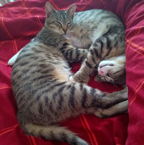 Tomcat Lupin (solda) ve kedi Tonks (sağda) gerçekten iyi yerleştiler ve mevcut dişi kedi ile çok iyi anlaşıyorlar.